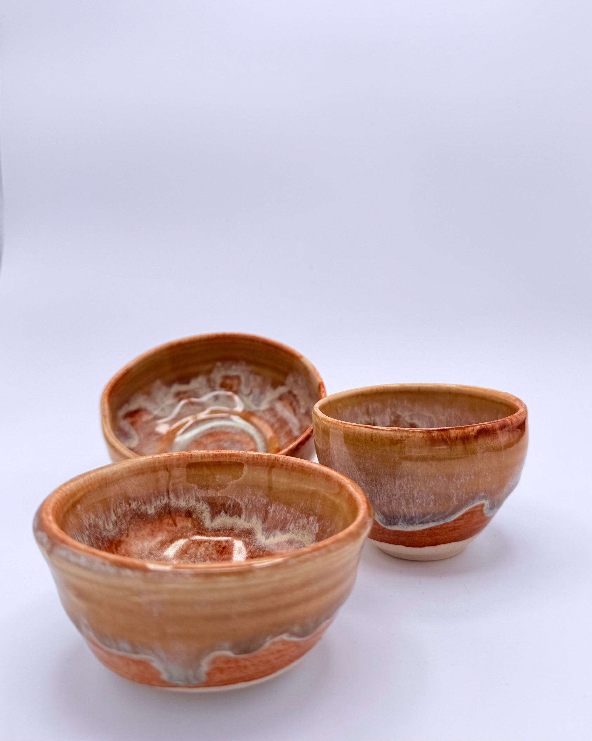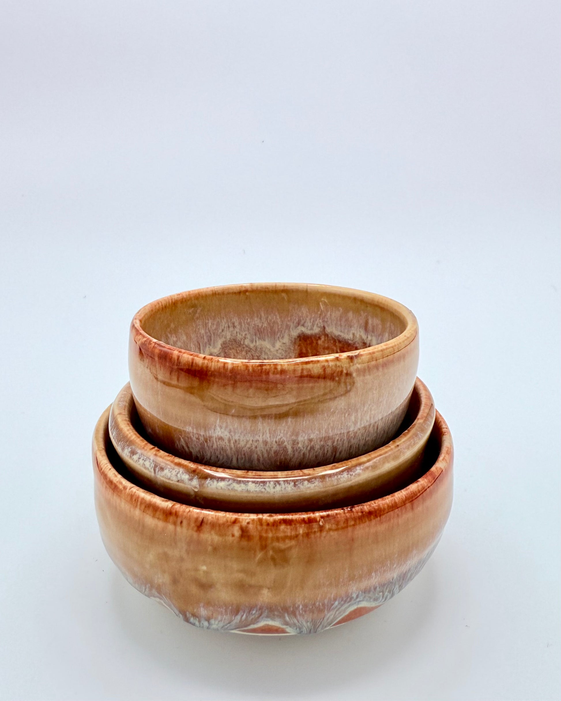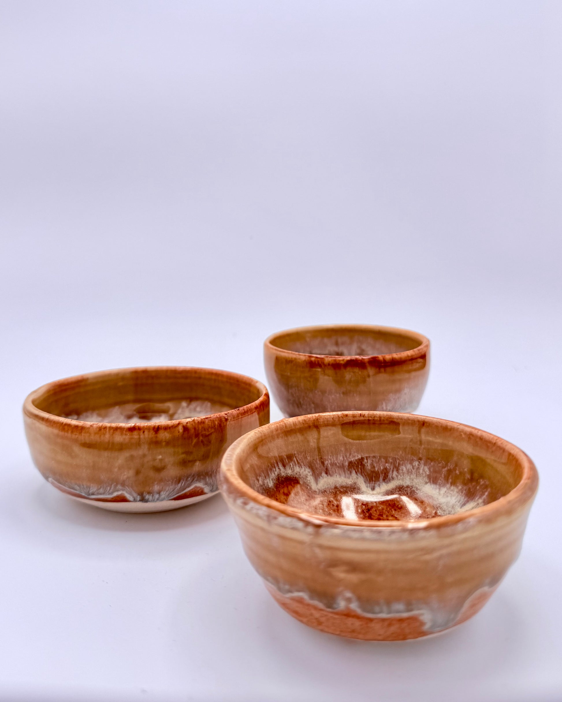 Set of three petite caramel-glazed bowls with cascading honey tones. Perfect for dips, garnishes, or displaying your small treasures. Each slightly different in the best handmade way.